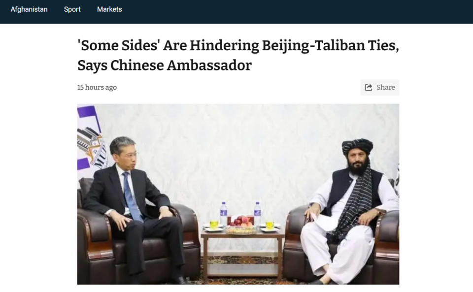 日前,在会见阿富汗塔利班临时政府城市发展和住房部长诺曼尼时,中国驻阿富汗大使赵星表示,“有些人不希望中阿政治和外交关系发展和延续,并试图制造障碍。中国关注到了这一问题,希望阿方也予以关注。”